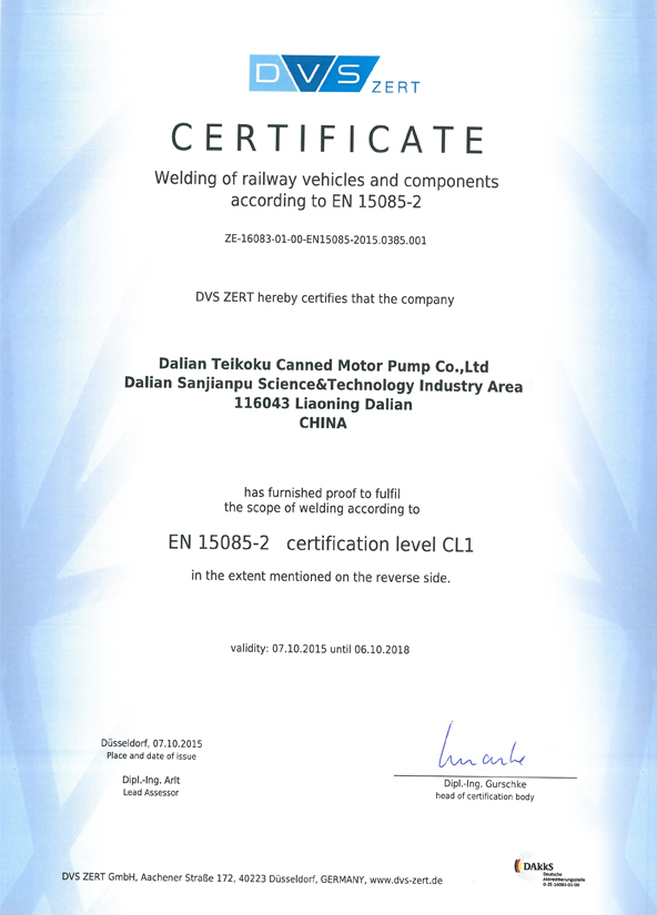 The issuance of EN15085 certificate proved that quality control system of Dalian Teikoku’s locomotive pumps meet European railway industry’s standard for consistency in product design, process technology, fabrication and welding operations. EN15085 certification is the crucial passport for Dalian Teikoku to enter international market.