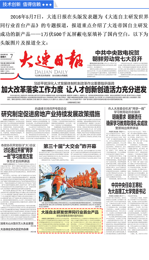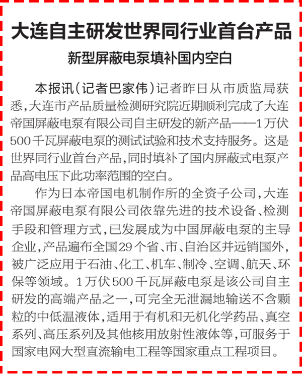 大連日報頭版報道我公司自主研發(fā)成功世界首臺1萬伏500千瓦屏蔽泵產(chǎn)品