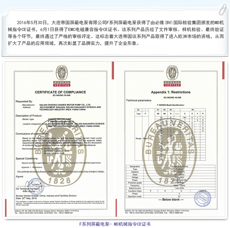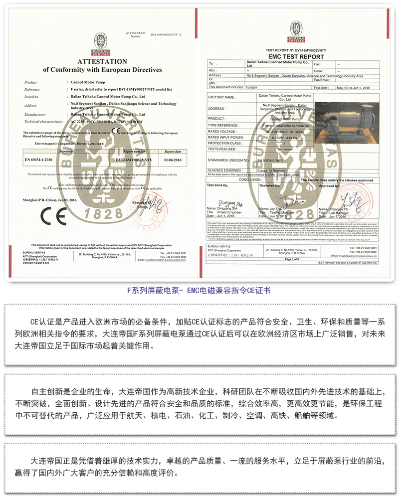 大連帝國(guó)F系列屏蔽電泵獲得歐盟CE認(rèn)證 2016-07-04
