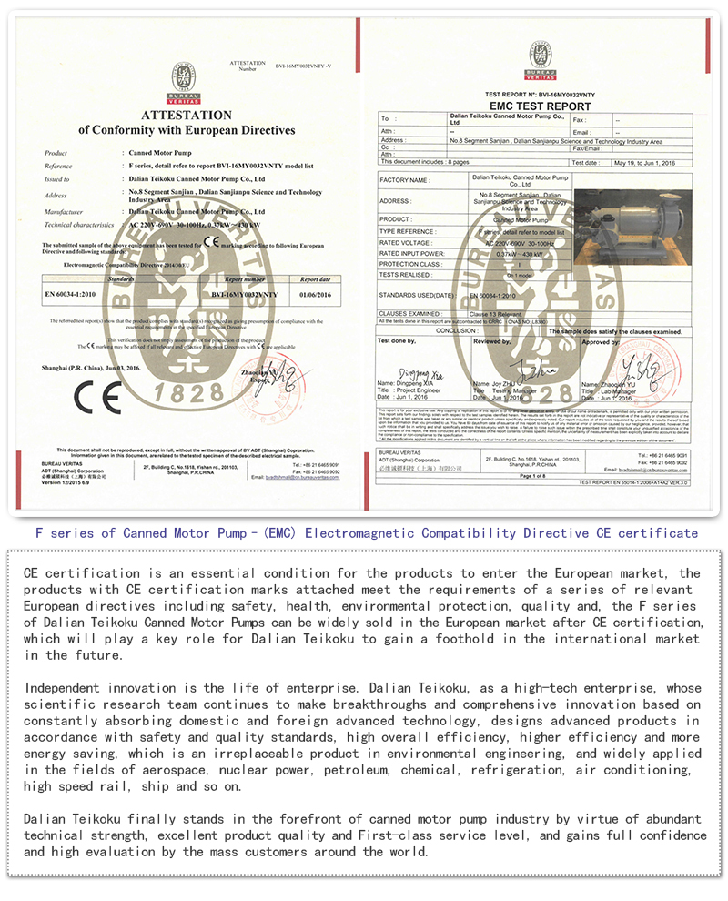 The F series of Dalian Teikoku Canned Motor Pump to acquire the EU CE certification 2016-07-06