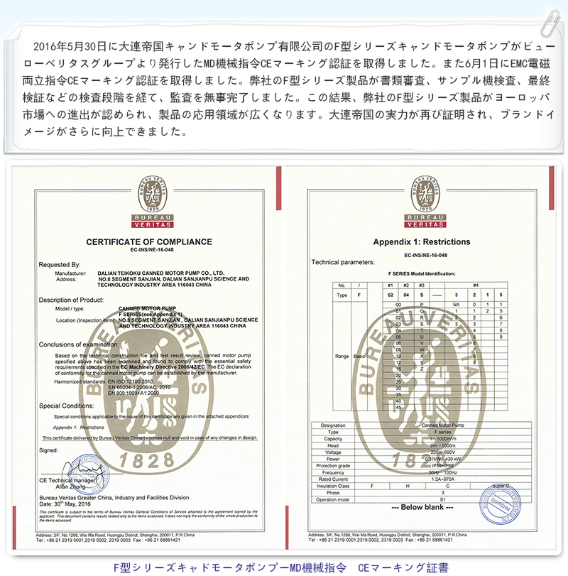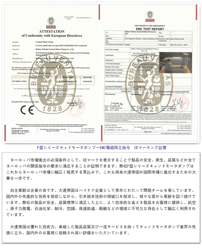 大連帝國(guó)F型シリーズキャンドモータポンプがCEマーキング認(rèn)証を取得!
