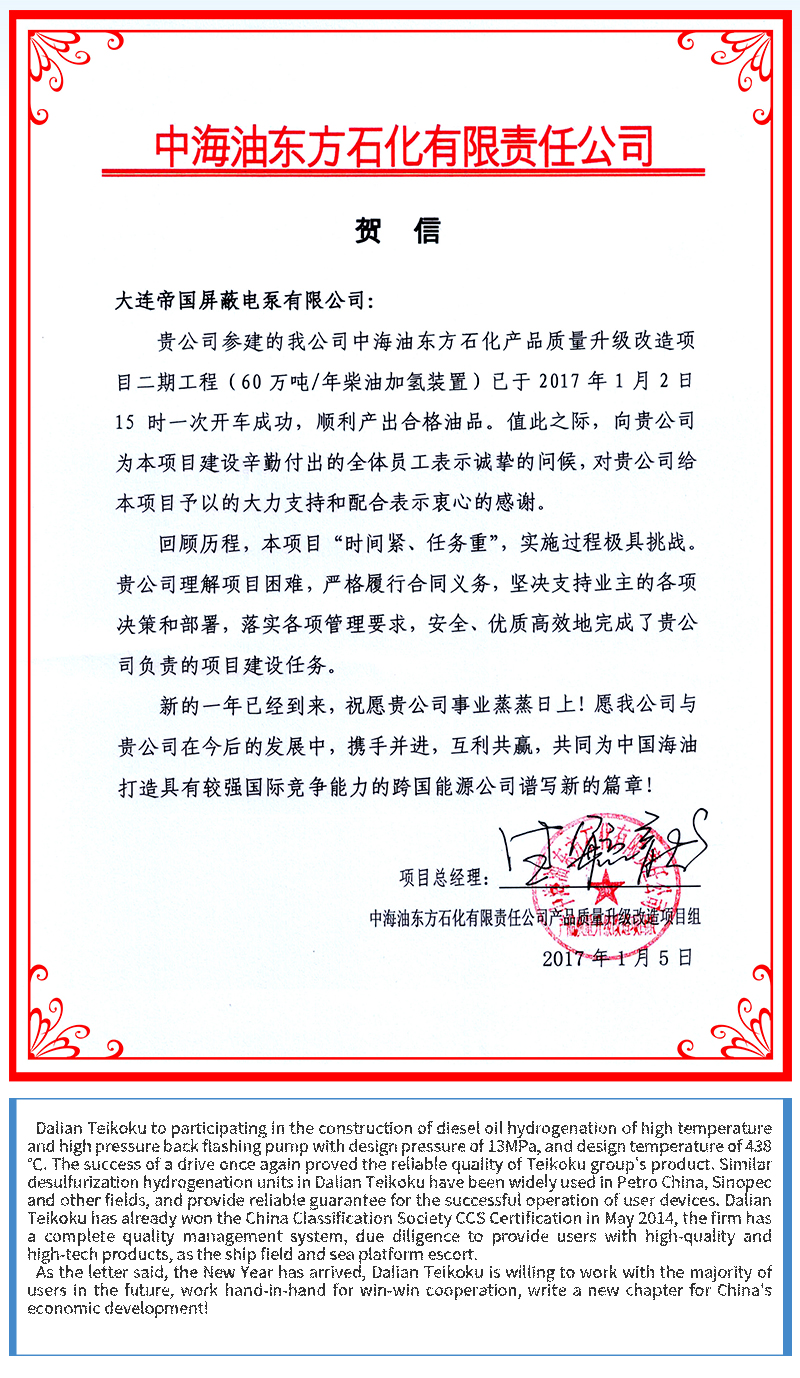 Letter of Congratulation: A successful drive of a major upgrade of CNOOC Dongfang Petrochemical Project