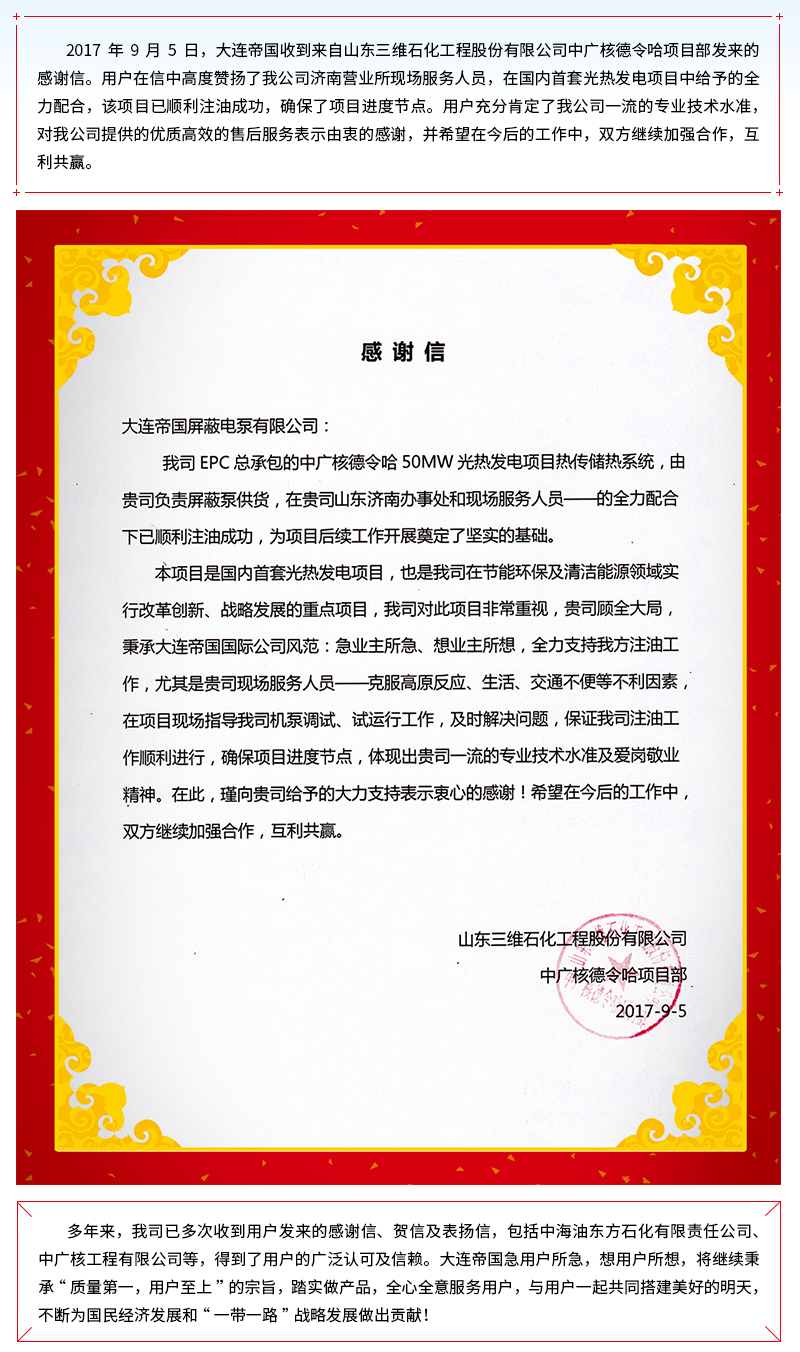 優(yōu)質服務再獲認可|我公司收到國內首套光熱發(fā)電項目用戶的感謝信