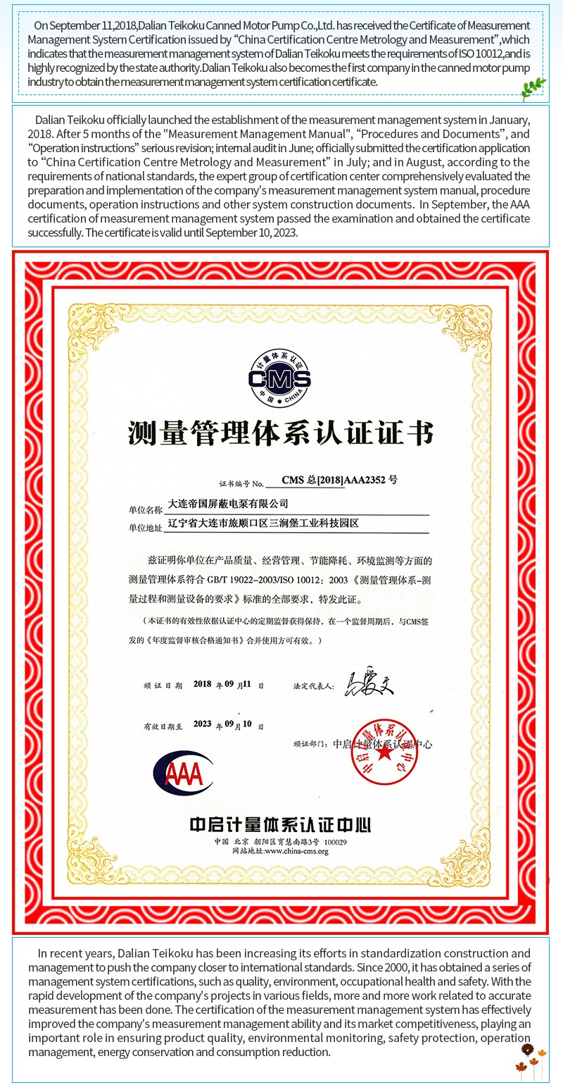 The first “Measurement Management System Certification Certificate” for canned motor pump industry in China