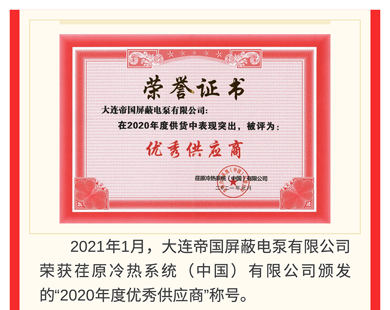 我公司榮獲荏原冷熱系統(tǒng)(中國)有限公司“2020年度優(yōu)秀供應(yīng)商”稱號!