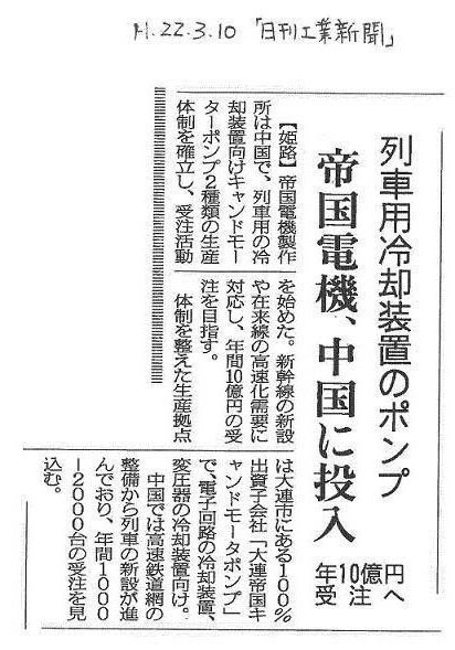 2010年3月10日,日本《日刊工業(yè)新聞》報(bào)道:帝國(guó)電機(jī)制作所已在中國(guó)建成兩種面向高速機(jī)車(chē)?yán)鋮s裝置用屏蔽泵的生產(chǎn)體制,并已在中國(guó)國(guó)內(nèi)全面開(kāi)始接受這兩種高速機(jī)車(chē)用屏蔽泵的批量訂貨,預(yù)計(jì)年訂貨額可達(dá)10億日元??扇鏉M(mǎn)足中國(guó)新建高速鐵路以及既有鐵路提速的需要。