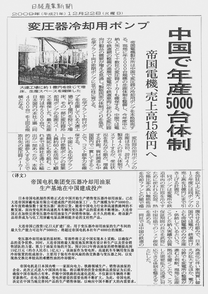 日本著名報(bào)紙《日經(jīng)產(chǎn)業(yè)新聞》報(bào)道帝國電機(jī)集團(tuán)在大連帝國開始生產(chǎn)油泵
